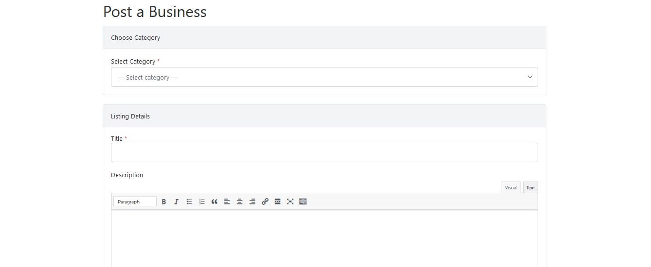 Now you can post your business information. Select a category, enter your business name, add a description, contact details, upload your logo and other photos. Once you have all of your information entered, click on the “Place a Listing” button in blue at the bottom of the page.